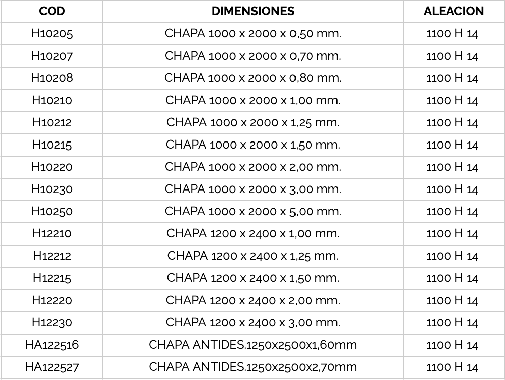 Disponemos de chapas de aluminio en diferentes espesores y medidas, adaptándonos a las necesidades de cada proyecto, desde usos industriales hasta aplicaciones decorativas. Gracias a sus propiedades, el aluminio es una solución eficiente para exteriores, estructuras livianas, revestimientos y fabricación de piezas.